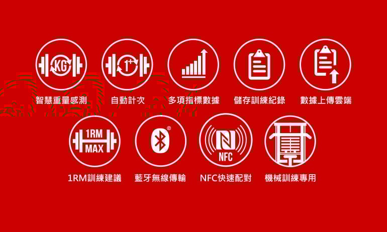 1RM訓練建議/藍牙無線傳輸/多項指標數據/自動計次/智慧配重感測/儲存訓練紀錄/資料上傳雲端