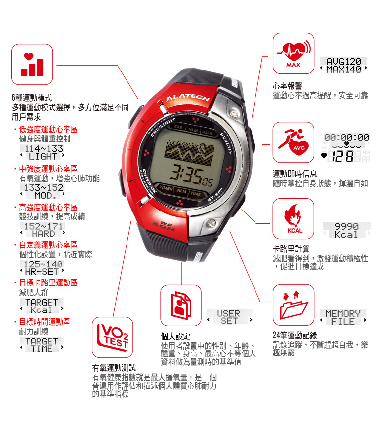本產品具備 6 種多功能心率鍛鍊方式,可針對個體需求,以自動或手動設定方式決定最合適、理想的訓練量。您還可透過即時資訊和記錄檔案,從中監測累計的熱量消耗與訓練效果。如果想要控制體重、改善體質或提升心肺功能,心率錶可為您的專屬運動教練,為您量身制訂個人化。